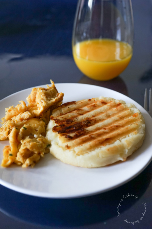 Typisches kolumbianisches Frühstück: arepa con queso mit Rührei und frisch gepresstem Saft