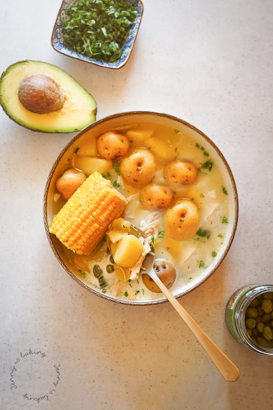 Hurra, heute öffne ich das 4. Türchen von Zorras famosen Adventskalender. Es gibt ajiaco, einen kolumbianischen Hühner- und Kartoffeleintopf. Es ist das mit Abstand meistgeliebte Rezept Kolumbiens von mir. Es stammt aus der Hauptstadt Bogotá und wird vollständig „ajiaco bogotano oder santafereño“ genannt. In Bogotá ist die Suppe oder der Eintopf so beliebt, dass man diese Speise gerne als Weihnachtsessen reicht. Zu kolumbianischen Weihnachtsbräuchen und -rezepten, kann man gerne hier schauen. Ich hatte bis dato dieses leckere Rezept jedoch noch nicht selbst zubereitet, weil ich immer dachte, dass einige wichtige Zutaten nicht in Deutschland aufzutreiben sind. Zum Beispiel das sogenannte Franzosenkraut bzw. Knopfkraut, das ich bisher noch nirgendwo gefunden hatte und was die Suppe so charakteristisch schmecken lässt. Das hat mich immer sehr betrübt. Aber alas, man kann sich ja auch zur Not was online bestellen bzw. wurde ich von einer Leserin darauf hingewiesen, dass es hier in München lateinamerikanische Geschäfte gibt, die dieses Kraut verkaufen. Und siehe da, ich konnte endlich mein liebstes Hauptgericht aus Kolumbien hier in Deutschland zubereiten! Als ich das erste Mal Hand anlegte, muss ich sagen, wow, das kam dem Original wirklich schon sehr, sehr nahe.