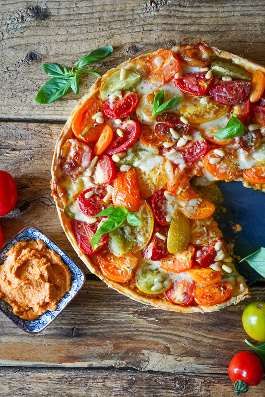 Heute gibt es eine leckere Tomaten-Tarte mit selbstgemachtem roten Pesto und natürlich einer dicken Schicht Tomaten! Wenn man auch das Pesto zubereitet, ist das mehr als ein Kilo Tomaten, was man da verarbeitet. Letztes Jahr habe ich zunächst das rote Pesto mit frischen Tomaten auf den Blog gestellt. Das Rezept ist super populär bei euch. Dieses Jahr schaffe ich es endlich auch meine geliebte Tomaten-Tarte, bei der auch das Pesto zum Einsatz kommt, vorzustellen. Sie besteht aus einer Schicht herzhaftem Mürbeteig, einer Schicht mit dem Pesto, einer Schicht frischen Tomaten und als Abschluss Käse und Pinienkerne. Ich mag diese Tarte super gerne, ich mache sie jedes Jahr mehrere Male. Hoffentlich habt ihr auch so viel Freude an dieser Tarte wie ich.