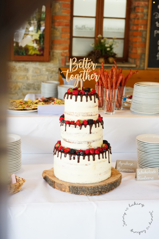 However, it looks like somehow I ended up making fancy cakes regardless. This time a couple asked if I could make a gender-reveal cake. Of course I could. It is not as common in Germany yet to make an event out of this. One thing I knew for sure was the fact that I didn’t want the traditional pink and blue on the cake, but instead went for a neutral color. In the end I went with a “bee” theme, because baby and babee seemed to be a cute pun. Even though I was not 100% satified with the cake (especially with the air bubble wrap) as it did not represent the honeycombs the way I wanted to, the parents were over the moon regardless. And it was quite a process to get this done in Germany. First I was handed a sealed letter by the doctor, which revealed the sex, this had to make it untouched to my apartment (the mom-to-be brought it herself), I baked the cake and obviously didn’t say a word to the parents until they cut into the cake and it showed a pink filling. By the way, the color was all done naturally, it simply was raspberries that did the job. As always all parts of the cake were edible, the bees as well, the honeycombs were made with candy melts. Since I am often asked about the cake toppers, I get them on Etsy. If you are interested in the recipe, let me know in the comments.