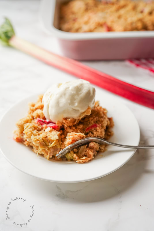 In the U.S. you will find desserts that contain a layer of fruit covered with some type of crumbs. They are called cobbler, crumble, or crisp. I brought today a rhubarb crisp and wanted to explain briefly what the similarities are and what are the differences. They all need relatively few ingredients and can easily be made by beginners. Would you like to give this dessert a try? I am sure it will miraculously disappear as quickly and easily as possible, there is only the two of us, however, it was gone so quickly. It really is addictive!
