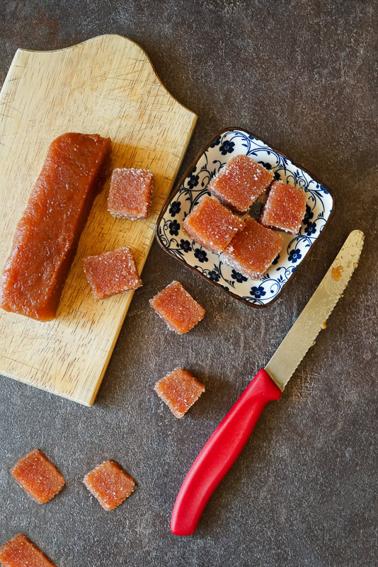 Have you ever heard of quince paste? I have another recipe on here done the old-fashioned way. Here in Germany it is usually cut into diamond shapes and rolled in additional sugar. It is then served as a sweet during Christmas season, as another cool addition on the cookie plate. Quince paste, however, is not only famous in Germany, it is also served in Spain and Latin America as a dessert with some strong cheese such as cheddar or in some regions in Spain with goat cheese. Usually it is called “dulce de membrillo”, or in combiation with cheese in Uruguay it is also called “postre Martín Fierro”. The same quince paste is accompanied by some savory component: cheese.